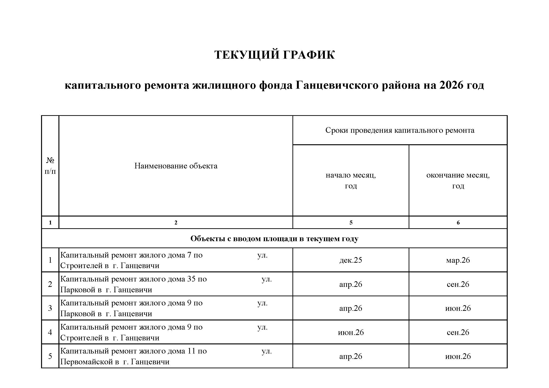 Текущий график капитального ремонта жилищного фонда Ганцевичского района на 2026 год