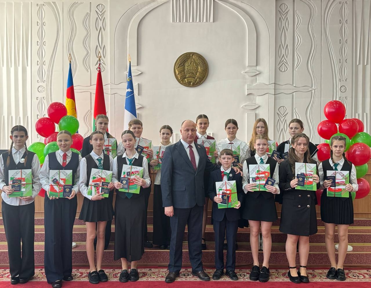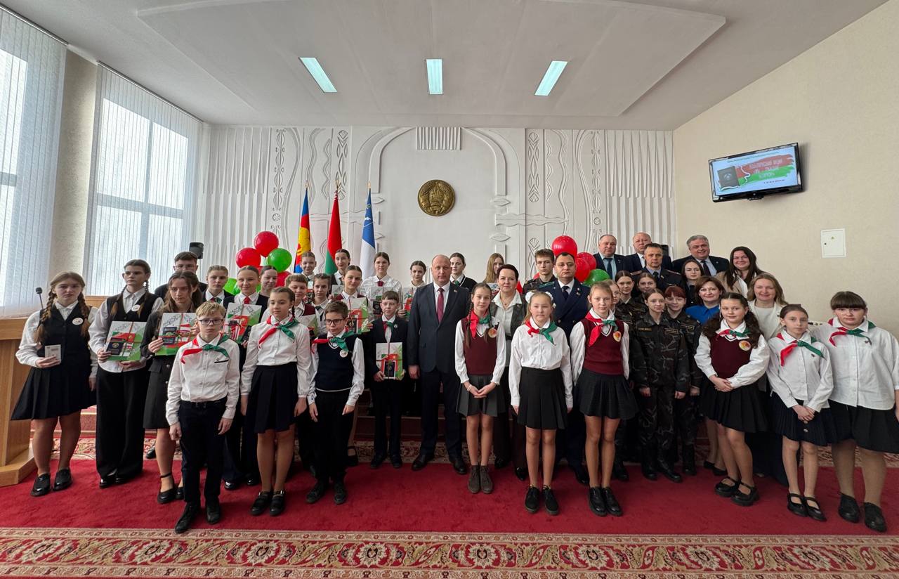 15 талантливых ребят вписали ещё одну яркую страницу в личную историю успеха - они получили паспорт гражданина Республики Беларусь из рук председателя райисполкома Павла Волчка.