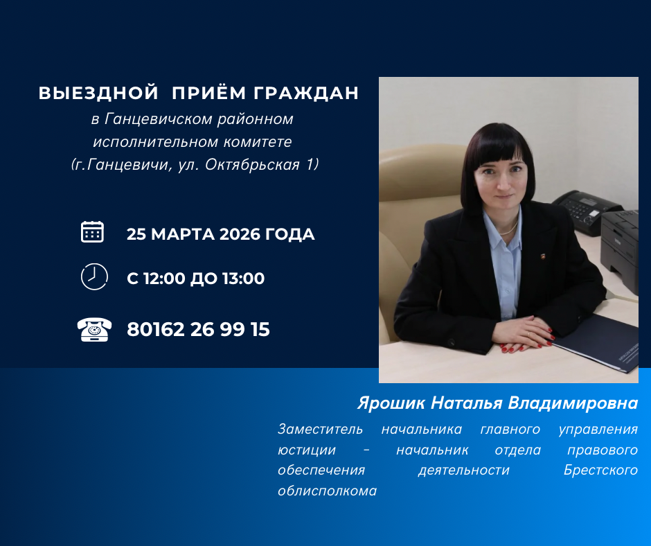 Выездной прием граждан» в Ганцевичском районном исполнительном комитете 25 марта 2026 года с 12:00 до 13:00 заместителем начальника главного управления юстиции Брестского облисполкома