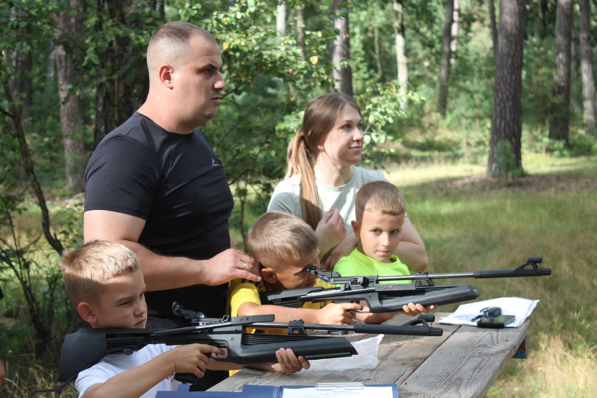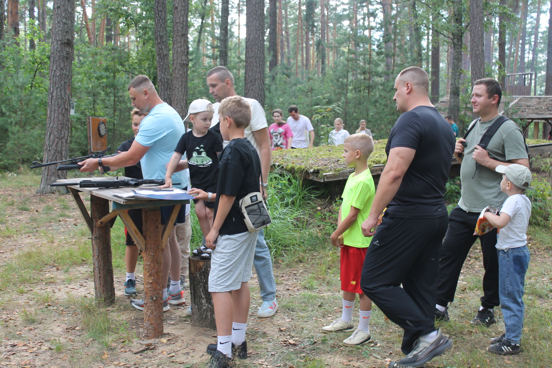 так и дети, состязались в стрельбе из пневматической винтовки, в дартсе и кольцебросе.