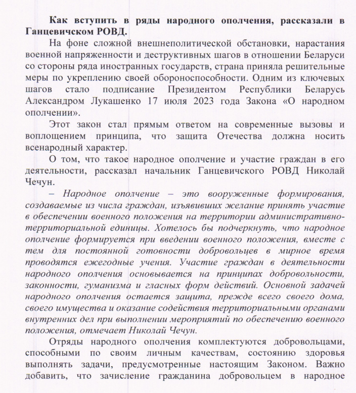 Как вступить в ряды народного ополчения, рассказали в Ганцевичском РОВД